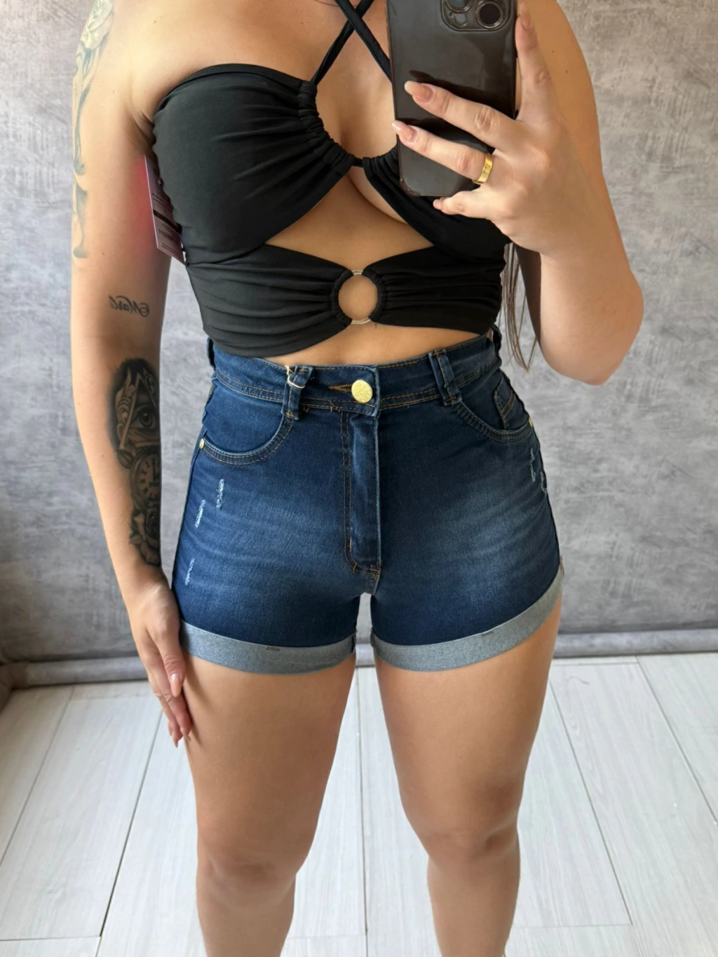 Short sal e pimenta lavagem escura botão dourado com detalhe na frente SKU 6157